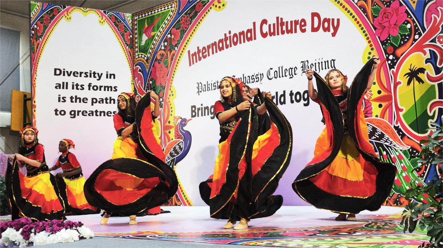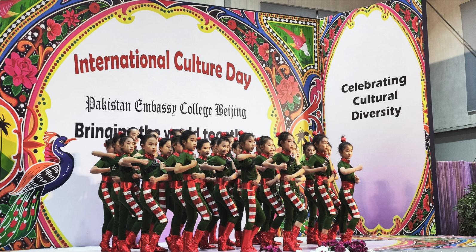 巴基斯坦北京使馆学校国际文化日活动上学生们跳起了中国彝族舞蹈,不同民族、种族的互相吸引、互相羡慕催生进步与发展