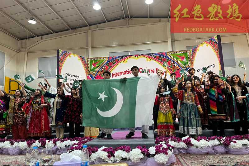 2023年11月26,巴基斯坦驻华使馆和巴基斯坦北京使馆学校的师生激情演绎“祖国和我”歌舞演出,随着各国国歌轮番播放,巴基斯坦使馆学校的各国师生高举本国国旗,舞动本民族舞蹈,集体重温本国独立的光辉时刻!